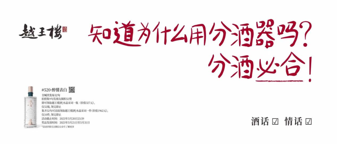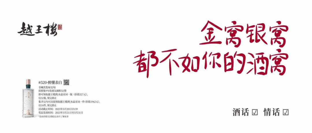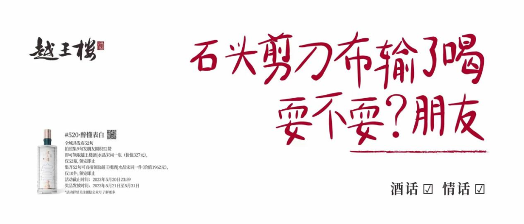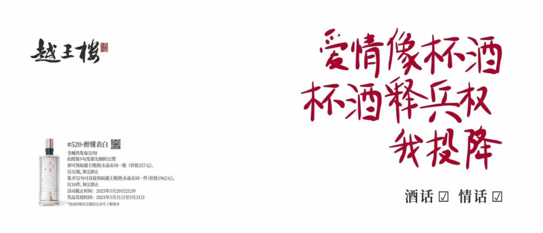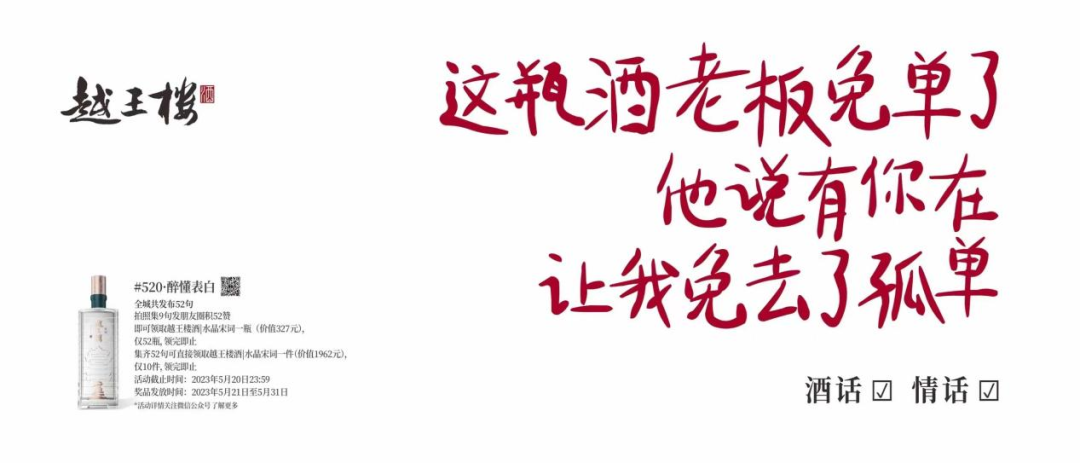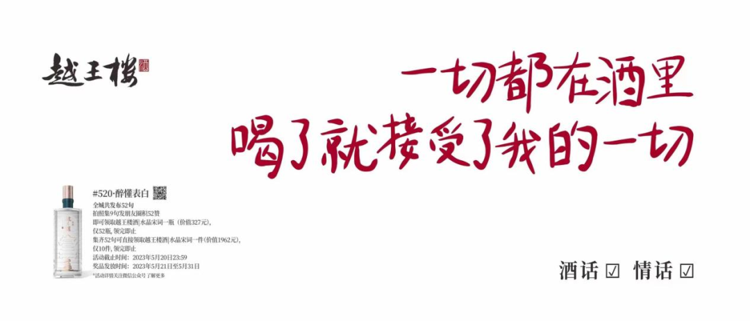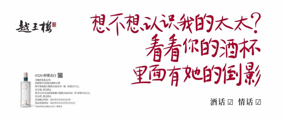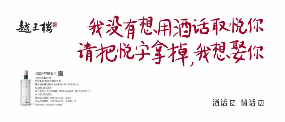 发表时间:2023-05-15 16:22 越王楼酒·醉懂表白 < 2023/05/20> ![]() 一定还有很多人不知道越王楼酒推出了「520·醉懂表白」的活动,是这样的: 我们在全城发布了52句酒话情话傻傻分不清的广告,总共208个站台广告,它们长这样的: ![]() ![]() ![]() ![]() ![]() ![]() ![]() ![]() 学会了吗?酒壮怂人胆,借着酒劲儿表白,TA接受了,你说的就是情话,TA不接受,那你说的不过是酒话,朋友照做、以后还有的是机会表白——还有比这更完美的套路吗? 拍照集9句发朋友圈积52赞,即可领取越王楼酒水晶宋词一瓶(价值327元),仅52瓶,领完即止; 如下是部分已经参与成功的盆友截图,玩法很简单,拍照,拼人品。 ![]() ![]() ![]() ![]() ![]() ![]() 如果你以为这就是全部了,No,No,No,No,No,No,No,No,No!我们还将在520当天与西蜀网一起推出更好玩的活动,请留意5月19、5月20两天的西蜀网,到时候我们也会在越王楼酒的公众号上给出相应参与链接。 总有些人,一喝酒就会想起某个人,难道你们没意识到:当初你就该趁着酒劲把该说的说了、该做的做了吗?过分的瞻前顾后是爱得不够坚决、一味的左顾右盼是渣体质作祟,爱一个人的勇气不够,就要酒来凑! 在爱情这件事上,不要给自己后悔的机会——没有拥有过的人,是不会有「失去」的资格的。 快去拍下、记下其中任何一句,带上越王楼酒跟TA约会——520只有24小时,一说出口,兴许你就赢得了无数个24小时。 看好你们哦! 蜀万家酒业 微信号 18981109039 |
